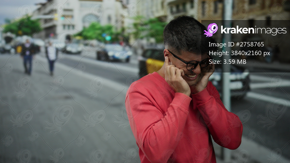 Young man in glasses expressing emotion on a bustling city street background with taxis and pedestrians passing by on a bright day.