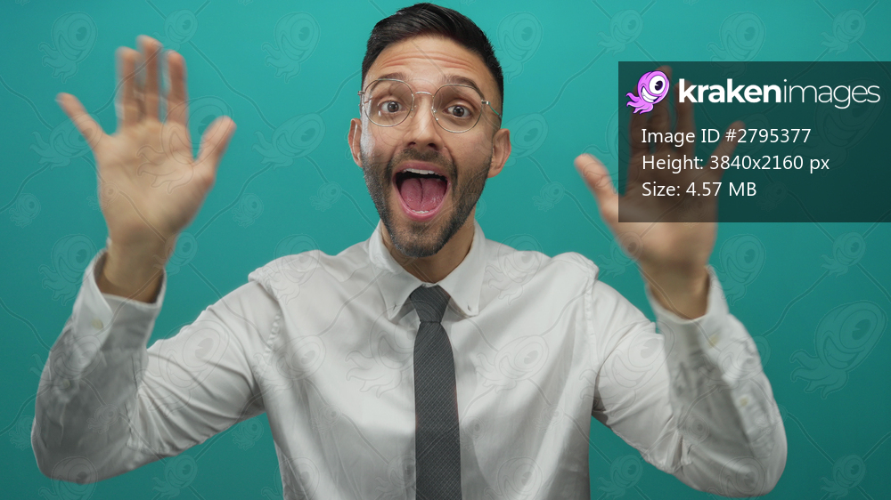 Young man in glasses expressing excitement with hands raised against a vibrant blue background, wearing a white shirt and tie.