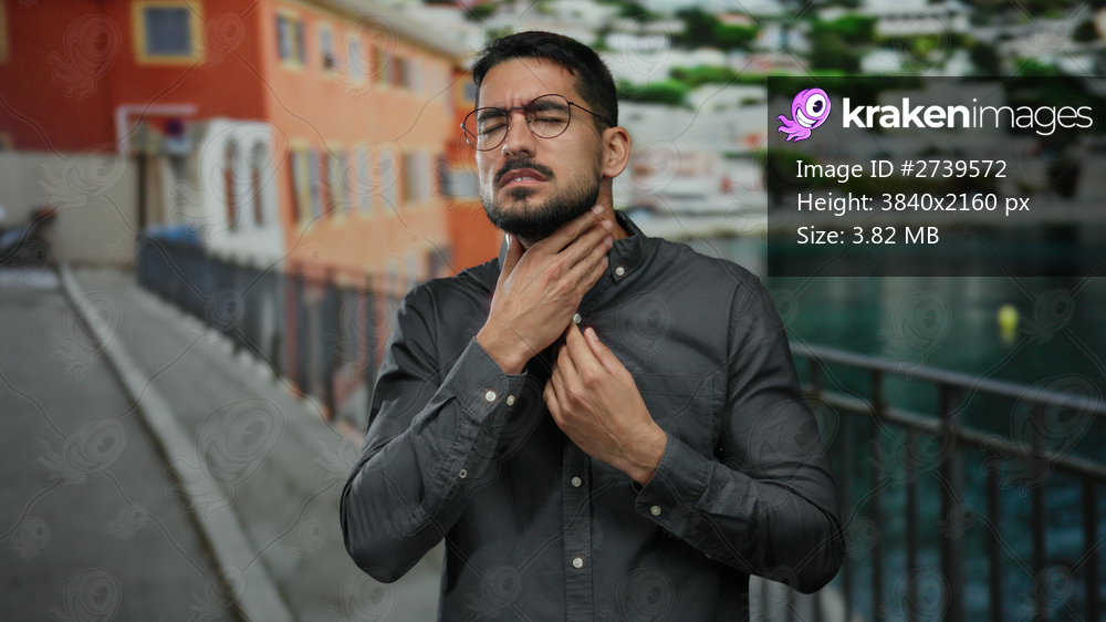 Young man in glasses and gray shirt stands on promenade near seaside holding throat with distressed expression against blurred beach backdrop