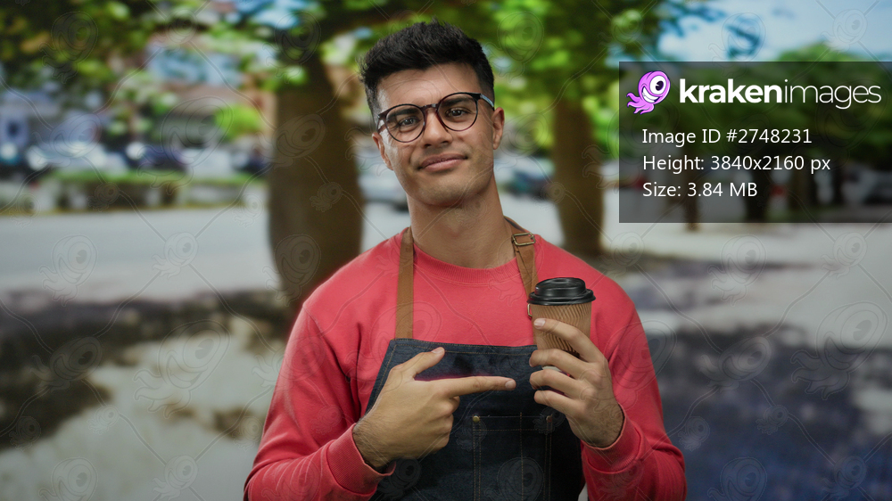 Young man in glasses holding coffee cup on urban street wearing casual red shirt and denim apron creates a relaxed outdoor city scene.