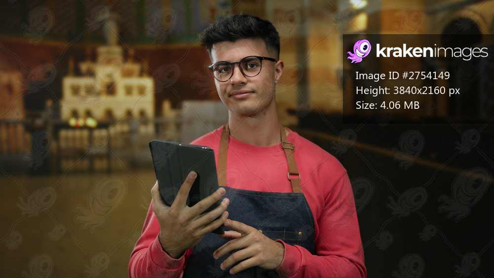 Young man in glasses holding tablet inside church with ornate architecture and arches, wearing casual apron, expressing confidence while standing in reflective indoor setting. - Kraken Images