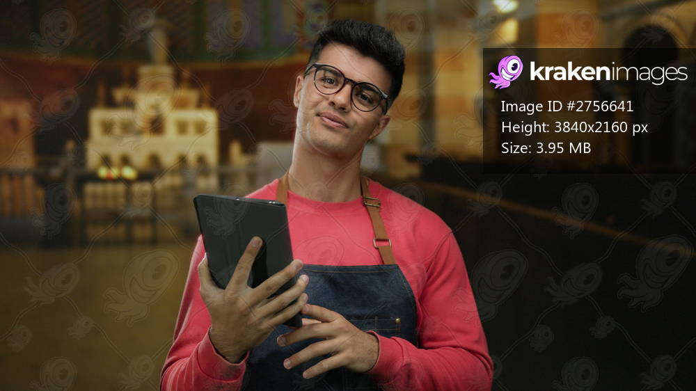 Young man in glasses holding tablet inside church with ornate architecture and arches, wearing casual apron, expressing confidence while standing in reflective indoor setting. - Kraken Images