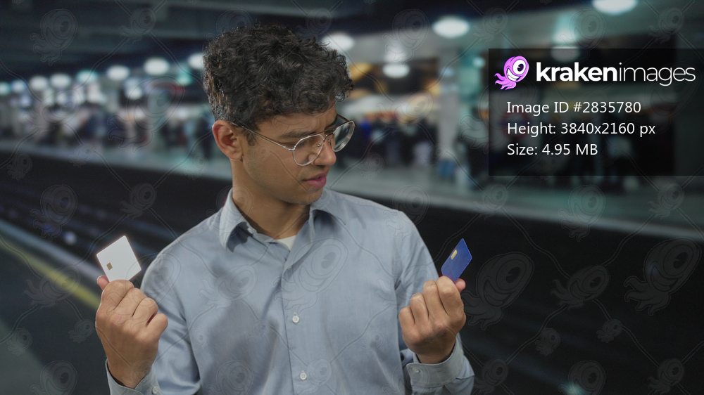 Young man in glasses holds creditcard on building platform with blurred commuters behind; confusion decision.