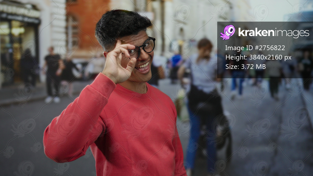 Young man in glasses playfully posing on a bustling city street with blurred pedestrians, showcasing urban energy and vibrant city life.