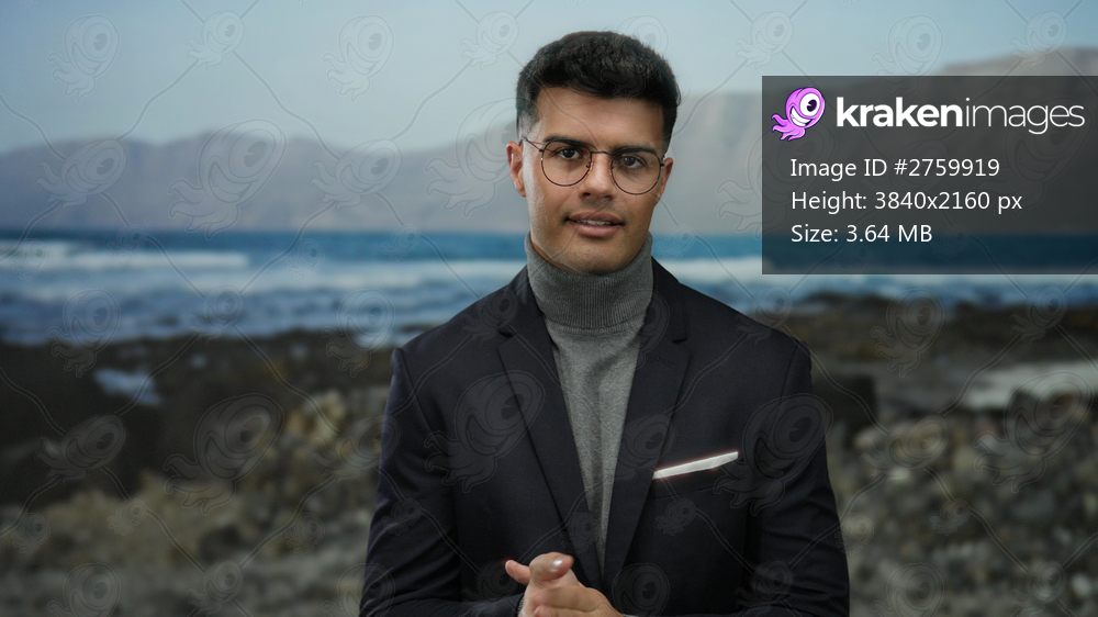 Young man in glasses standing on a seaside beach with mountains in the background wearing a turtleneck and blazer looking confident in a serene outdoor setting during daylight. - Kraken Images