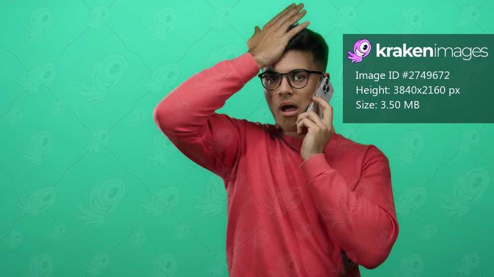 Young man in glasses talking on phone over isolated green background, wearing red sweater, expressing surprise and gesturing, highlighting communication and emotion. - Kraken Images