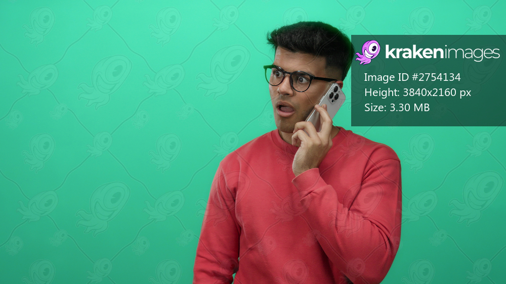 Young man in glasses talking on phone over isolated green background, wearing red sweater, expressing surprise and gesturing, highlighting communication and emotion. - Kraken Images