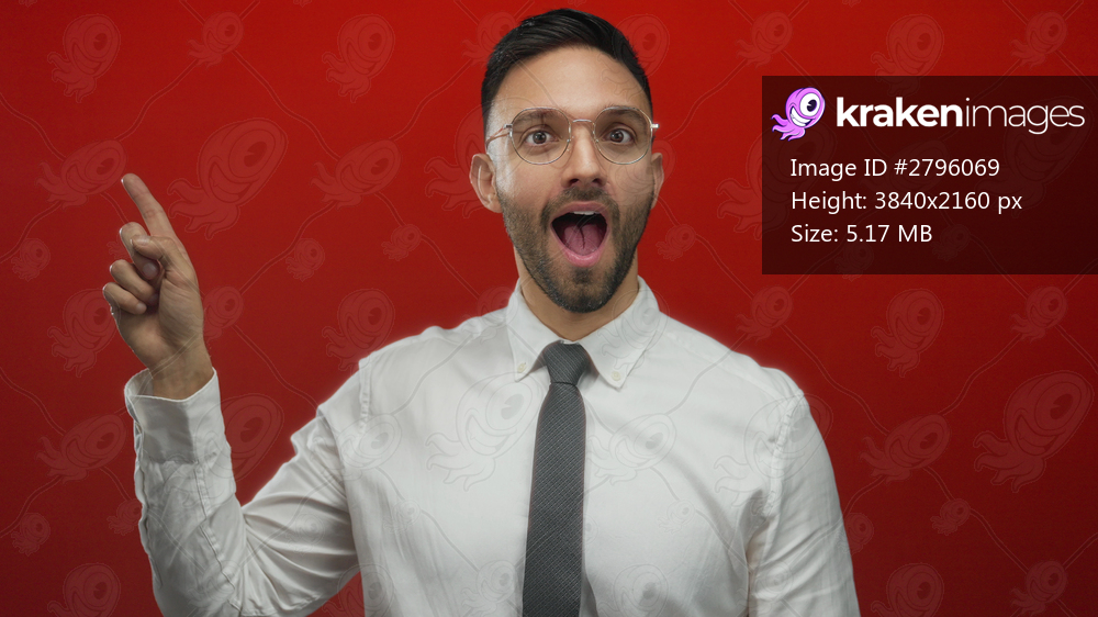 Young man in glasses and tie points upward with surprise against vibrant red background exuding curiosity and excitement