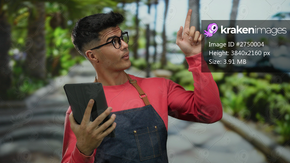 Young man in glasses using tablet outdoors in a lush park setting, wearing casual red attire and apron, looking focused and engaging with the touchscreen device. - Kraken Images