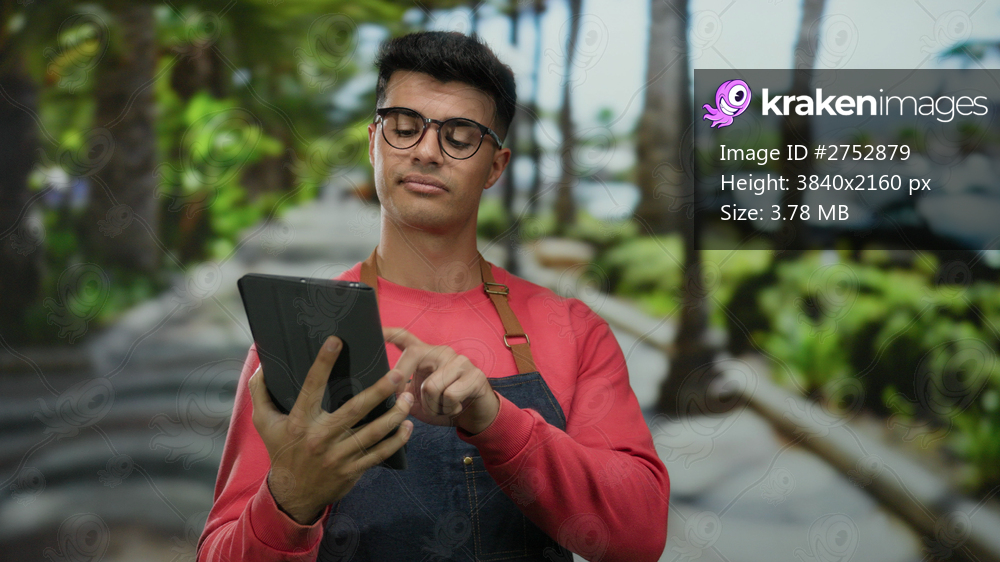 Young man in glasses using tablet outdoors in a lush park setting, wearing casual red attire and apron, looking focused and engaging with the touchscreen device. - Kraken Images