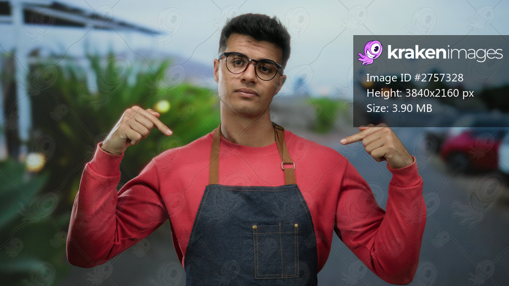 Young man in glasses wearing apron points at himself while standing confidently on an outdoor city street, embodying a lively urban vibe in a casual red sweatshirt. - Kraken Images