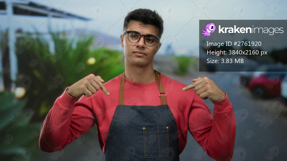 Young man in glasses wearing apron points at himself while standing confidently on an outdoor city street, embodying a lively urban vibe in a casual red sweatshirt. - Kraken Images
