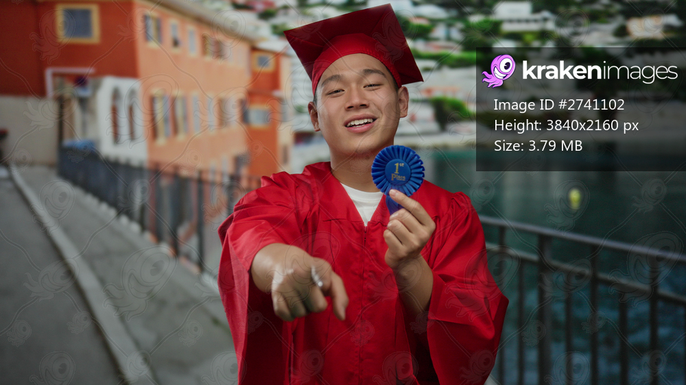 Young man in graduation attire pointing at the camera with a blue ribbon by the seaside promenade.