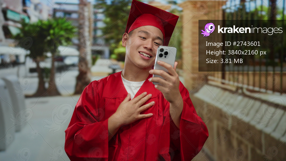 Young man in graduation gown joyfully video chatting on smartphone outdoors in urban street setting with modern buildings and greenery in the background. - Kraken Images