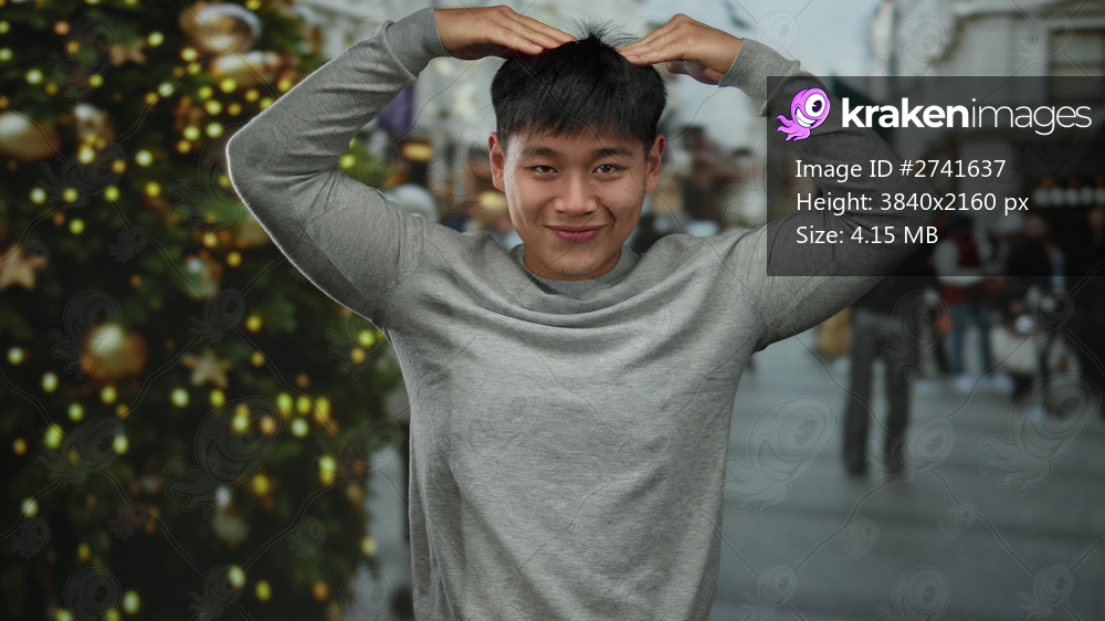 Young man in gray shirt smiling energetically with hands on head in bustling city street decorated for festive holiday celebrations.