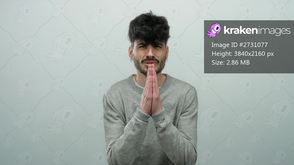 Young man in gray sweater poses against simple white background in thoughtful prayerful gesture expressing hope and contemplation.