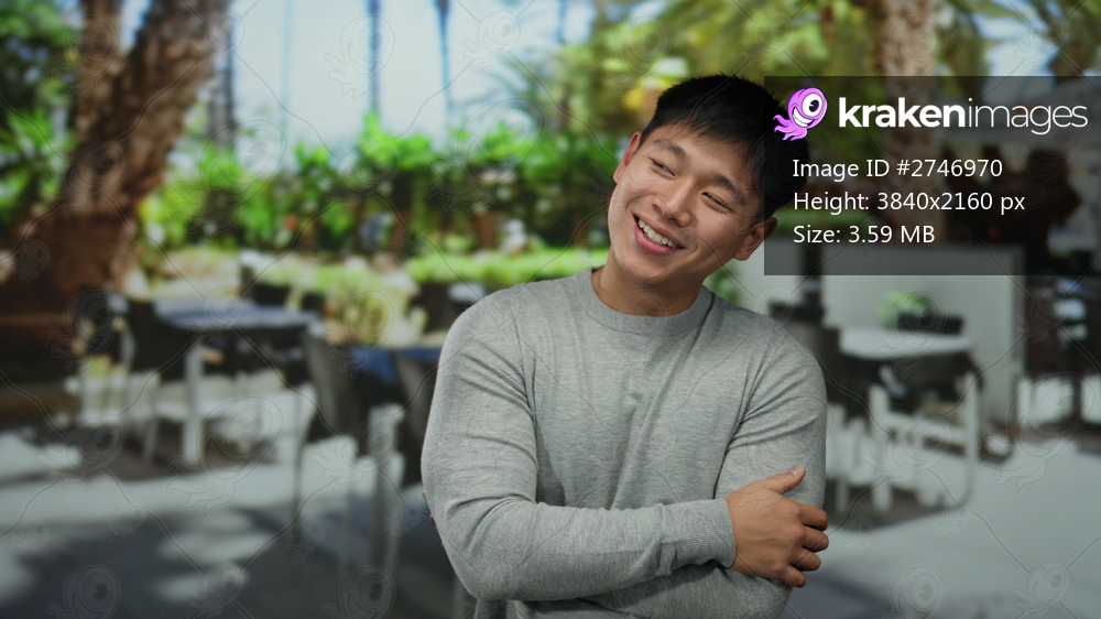 Young man in gray sweater smiling on an outdoor terrace at a coffee shop surrounded by greenery and tables under palm trees.