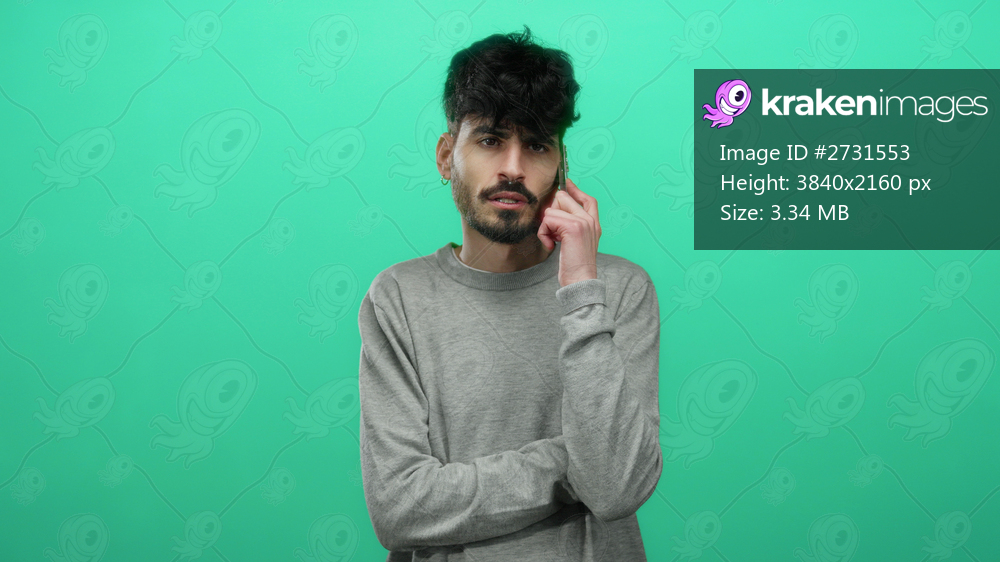 Young man in gray sweater talks on smartphone against an isolated green background showing a thoughtful expression with closed eyes.