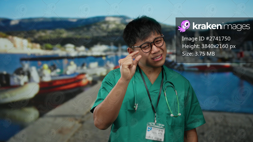 Young man in green scrubs gestures outdoors with a scenic port and boats in the background, showcasing a blend of medical professionalism against a maritime setting. - Kraken Images