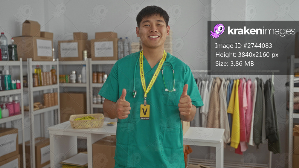 Young man in green scrubs gives thumbs up in a charity donation center room, showcasing teamwork and volunteerism with donation boxes and clothing racks in the background. - Kraken Images