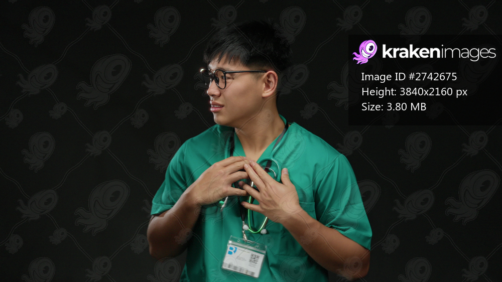 Young man in green scrubs standing isolated over black background, showcasing stethoscope around neck in professional setting.