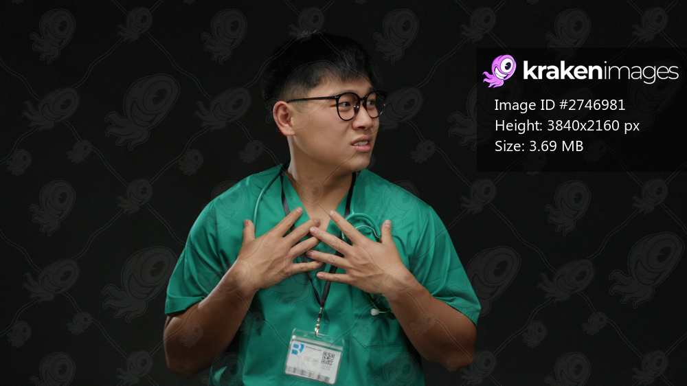 Young man in green scrubs standing isolated over black background, showcasing stethoscope around neck in professional setting.