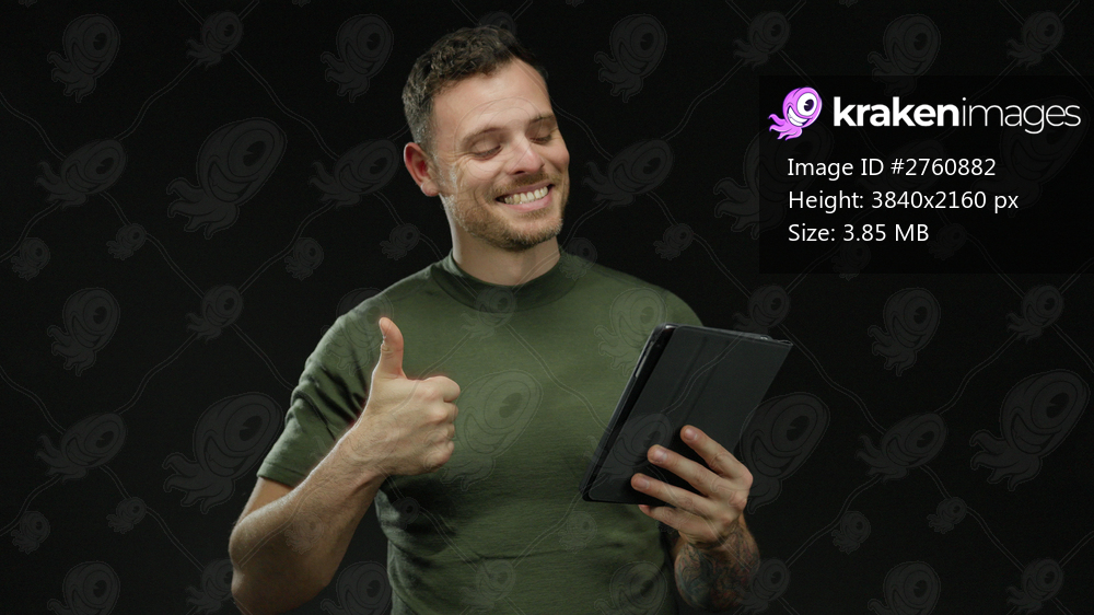 Young man in green shirt holds tablet and gestures thumbs up against dark background, conveying positive and interactive atmosphere, focusing on technology and expressions. - Kraken Images