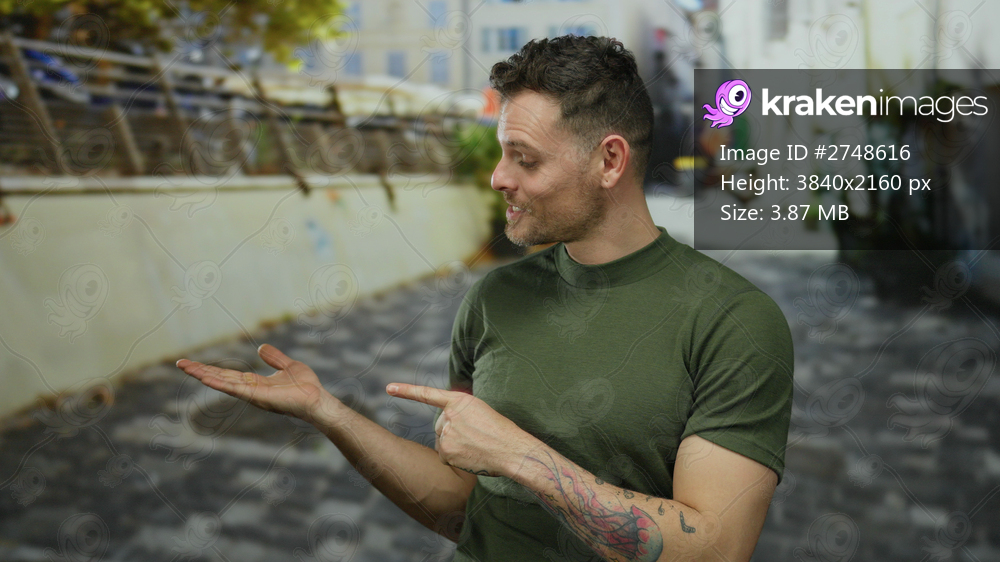 Young man in green shirt standing on urban street extends hand with tattoo visible, surrounded by vibrant city backdrop, showcasing modern city life with a focused expression. - Kraken Images
