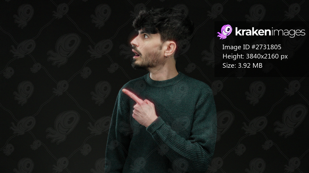 Young man in green sweater with surprised expression points to side against dark background conveying curiosity and intrigue.
