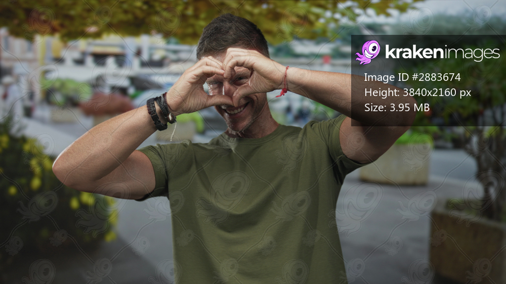 Young man in green t shirt forms heart with hands and smiles on busy street by planters and parked cars; love kindness happiness.