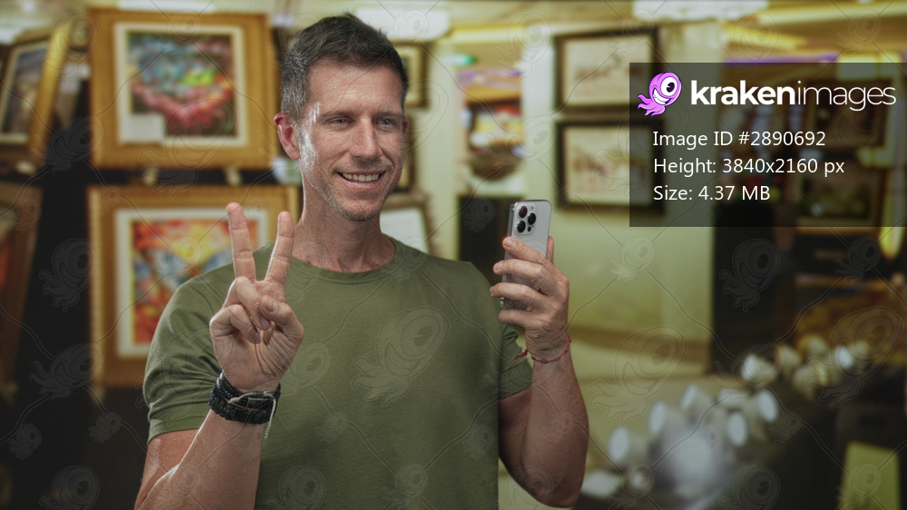 Young man in green t shirt smiles and shows peace sign with bare hand while holding smartphone amid framed paintings in gallery building; peace friendliness. - Kraken Images