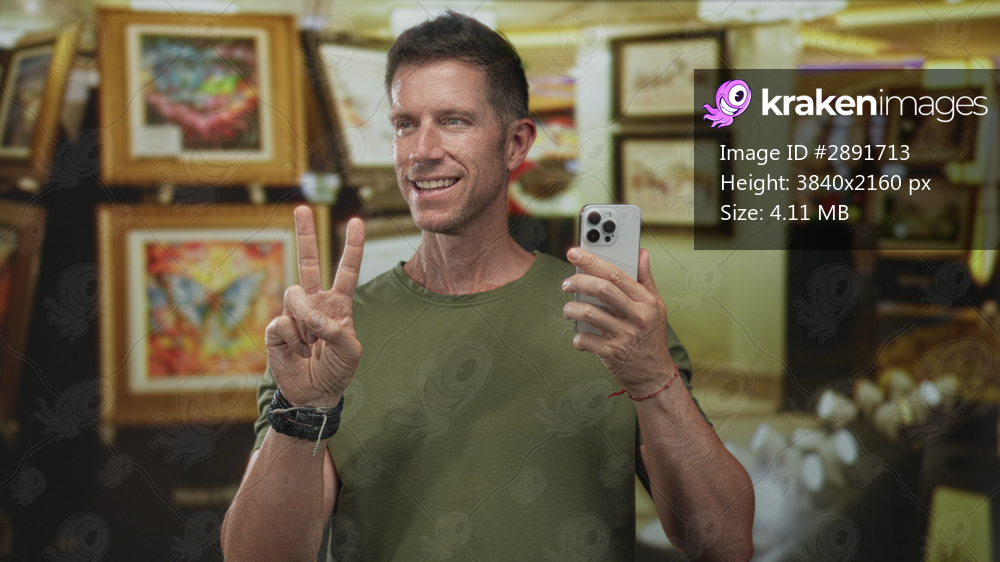 Young man in green t shirt smiles and shows peace sign with bare hand while holding smartphone amid framed paintings in gallery building; peace friendliness. - Kraken Images