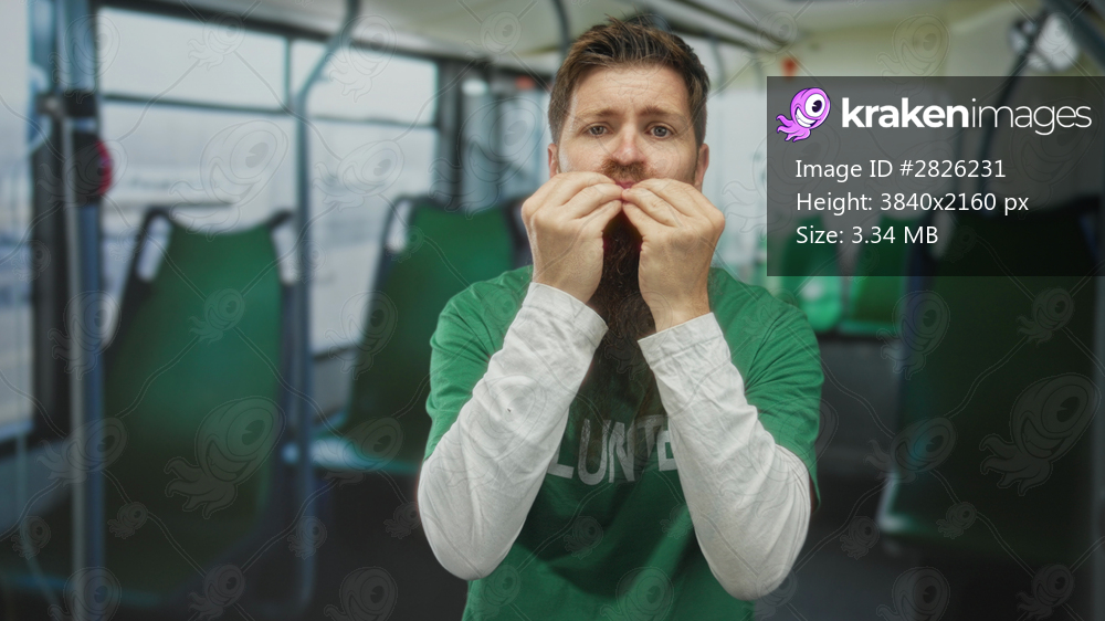 Young man in green volunteer shirt blows kiss with lips inside sparsely seated bus interior; affection playfulness.
