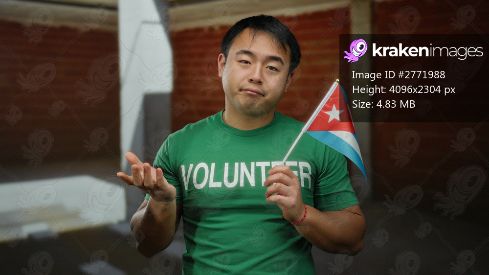 Young man in green volunteer shirt holding cuban flag at indoor construction site, conveying cultural diversity and community spirit in an industrial setting. - Kraken Images