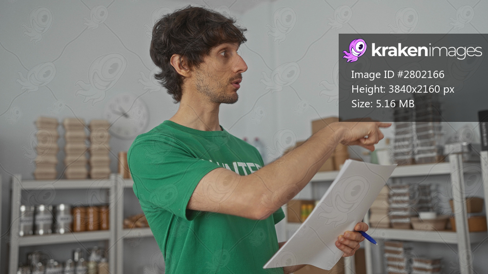 Young man in green volunteer shirt holds clipboard and points finger in building; community service.