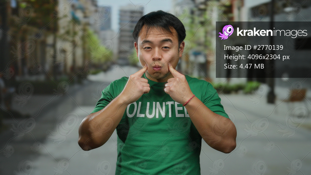 Young man in green volunteer shirt playfully posing on a city street with blurred urban background, creating a fun and lively outdoor atmosphere.