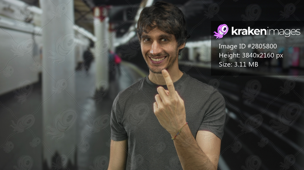 Young man in grey shirt smiling and pointing index finger at camera in train station building; teasing.