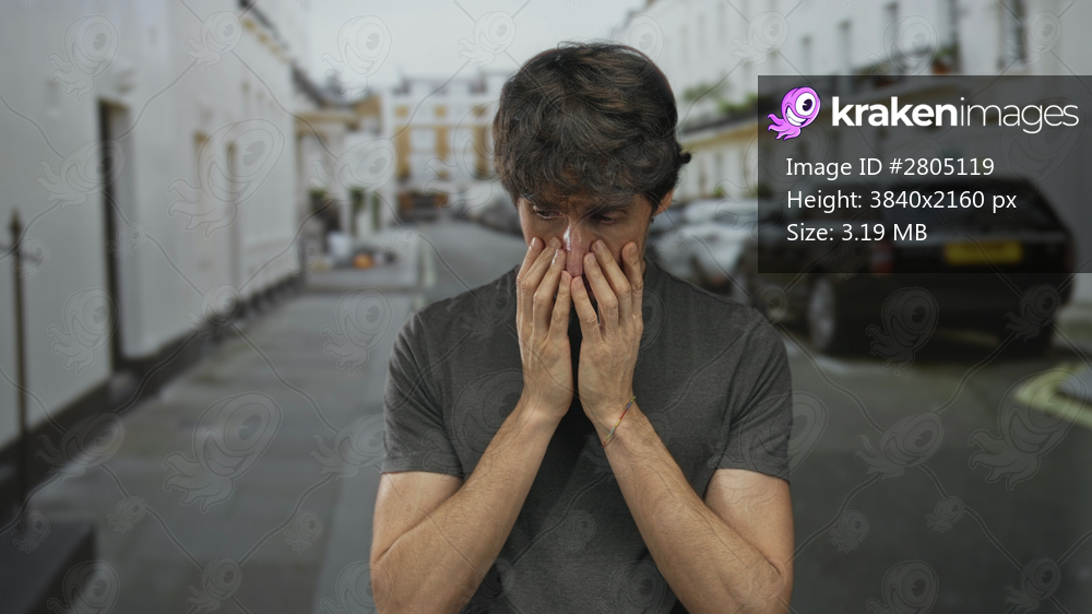 Young man in grey shirt standing with hands over face on empty street flanked by white townhouses; inner despair.