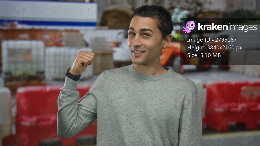 Young man in grey sweater points thumb toward building under construction outdoors and winks; confidence.