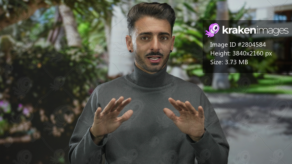 Young man in grey sweater raises bare hands for calm gesture amid green foliage and building on street; hesitation doubt caution restraint.
