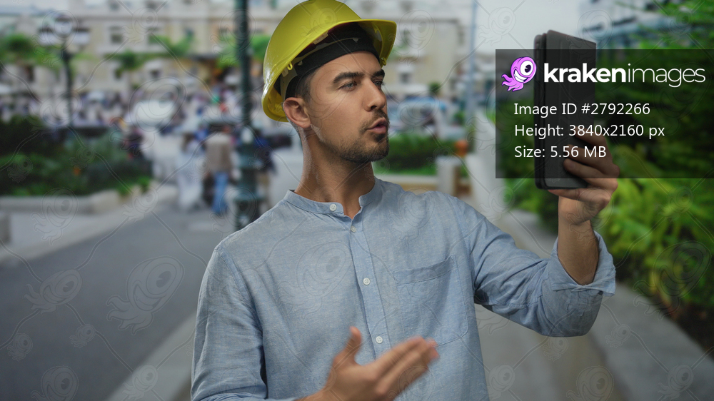 Young man in hardhat making video call on city street using tablet showcasing outdoor urban environment and construction concept.