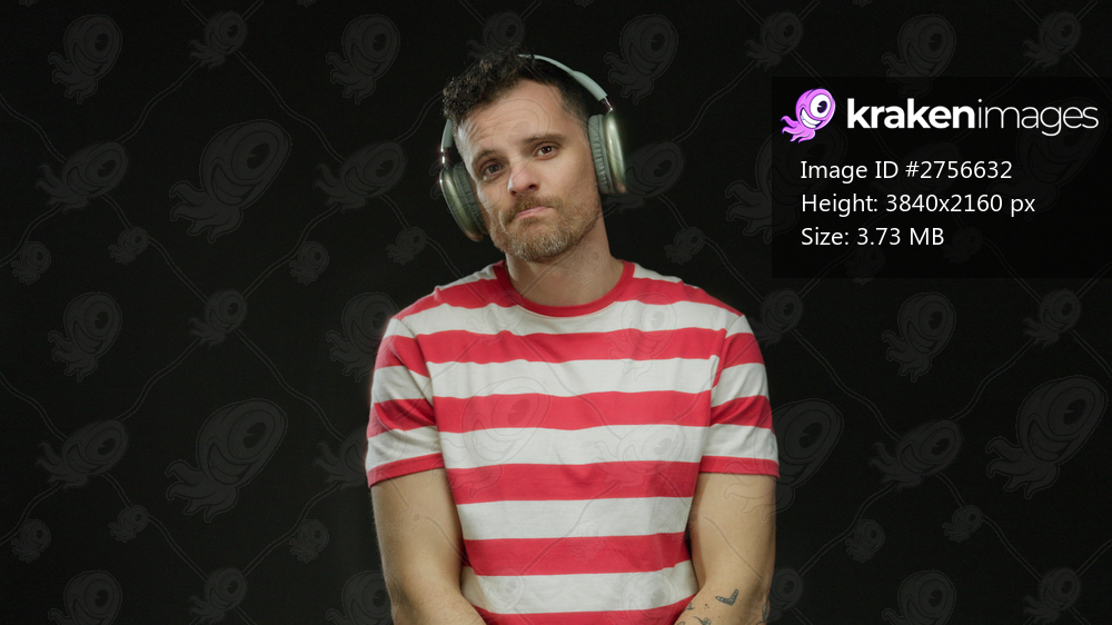 Young man in headphones wearing striped shirt against a black background with pensive expression highlights a relaxed mood and stylish fashion sense