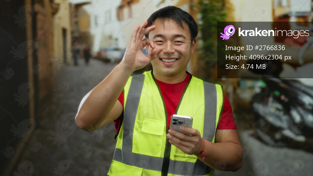 Young man in high-visibility vest smiling while using smartphone outdoors in urban street on sunny day, showcasing modern communication and technology use in city life - Kraken Images