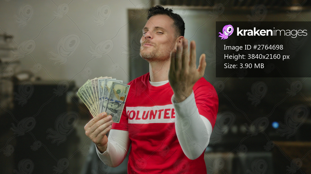 Young man in hotel holding american dollars with confident gesture wearing red shirt indoors showcasing wealth and inviting engagement in a casual setting. - Kraken Images