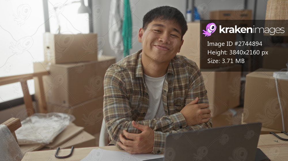 Young man in living room of new apartment surrounded by moving boxes, wearing plaid shirt and using laptop for planning or work, representing unpacking and settling in new home. - Kraken Images