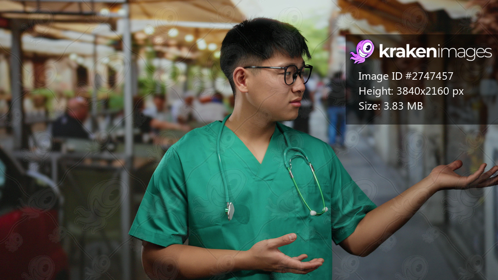 Young man in medical scrubs gestures while standing on a vibrant outdoor terrace, portraying a dynamic, inviting scene amid a bustling restaurant and coffee shop environment. - Kraken Images