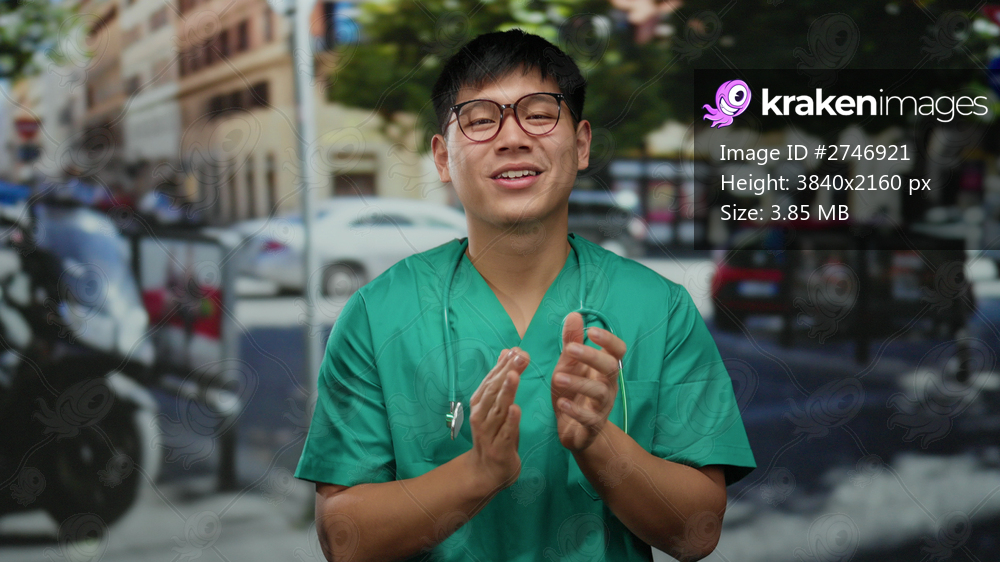 Young man in medical scrubs smiling and clapping joyfully on a bustling city street, reflecting happiness and positivity in a vibrant urban outdoor setting. - Kraken Images