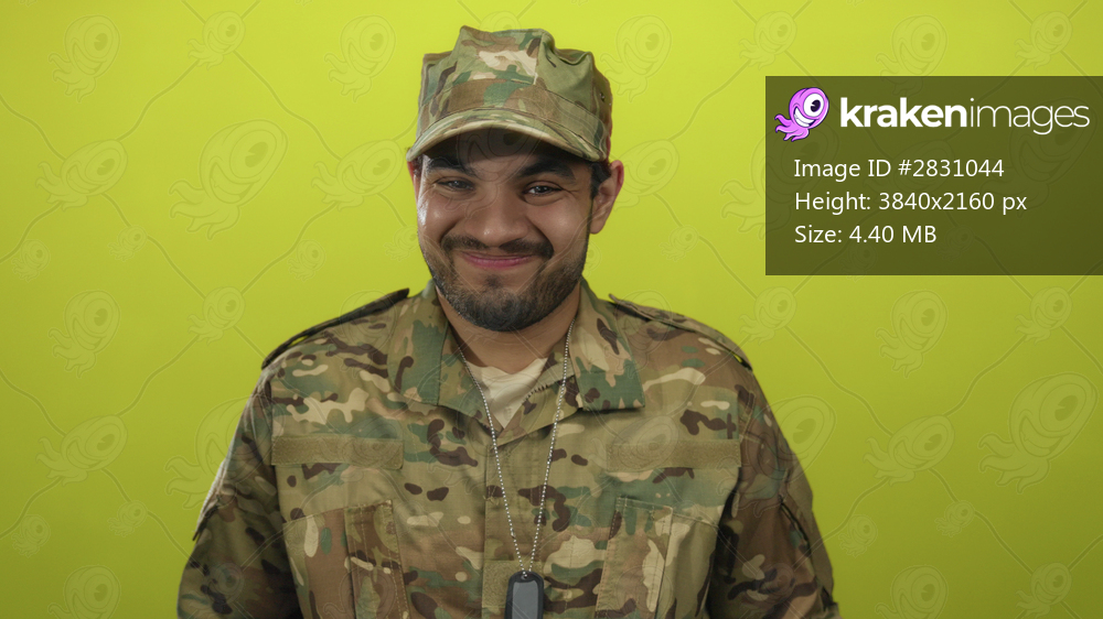 Young man in military uniform wearing dog tag smiling and shrugging palms up in studio; uncertainty.