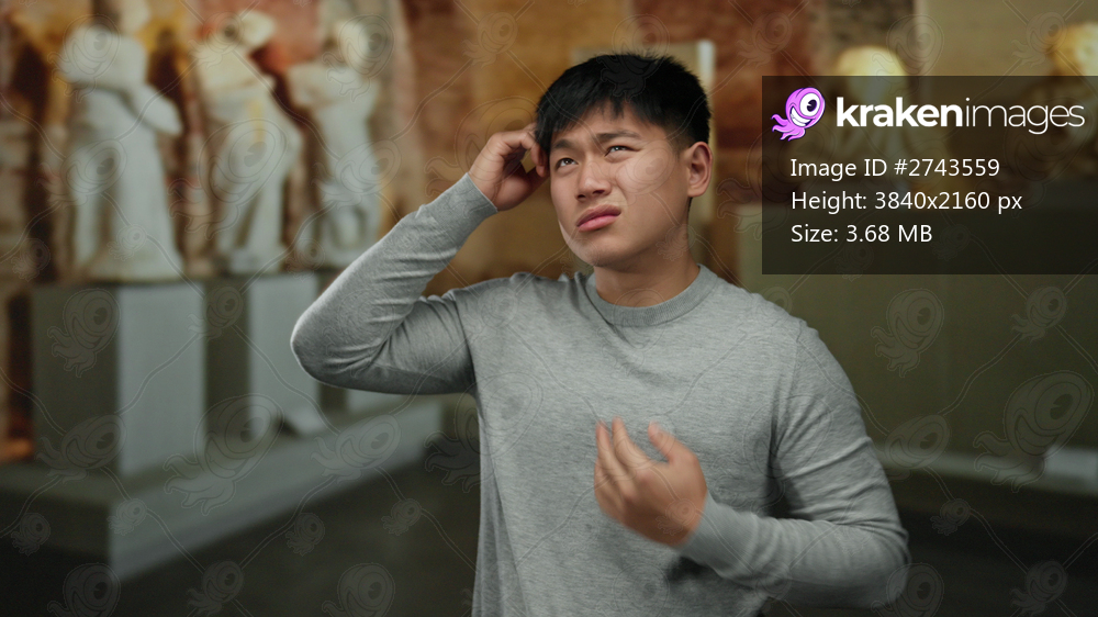 Young man in museum looking confused with ancient statues in the background, wearing casual gray sweater, expressing contemplation indoors with cultural art surroundings. - Kraken Images