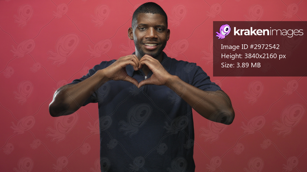 Young man in navy polo forms heart with hands and smiles in studio against red backdrop; love connection.